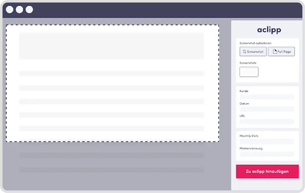 aclipp’s chrome extension helps in taking full page as well as selected area’s screenshot which can be clipped on a widget injected on any website. These clipped images along with websites relevant information is used by aclipp’s web Application to create PR reports.